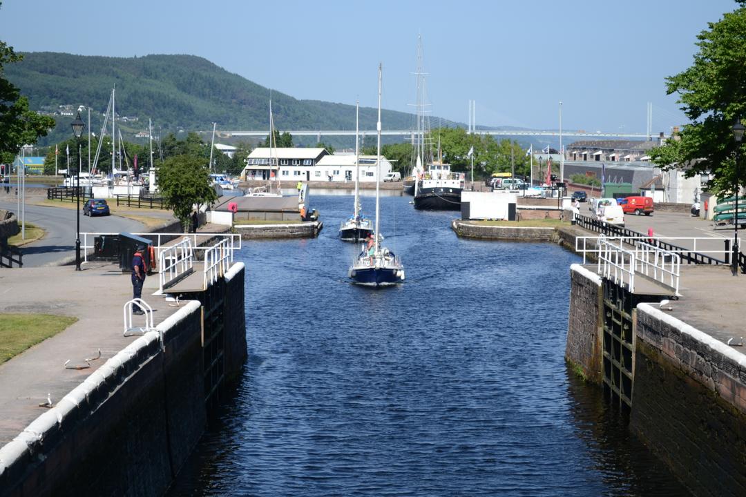 Looking down Muirtown Locks to open swing bridge